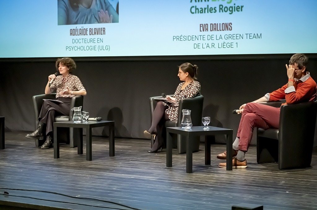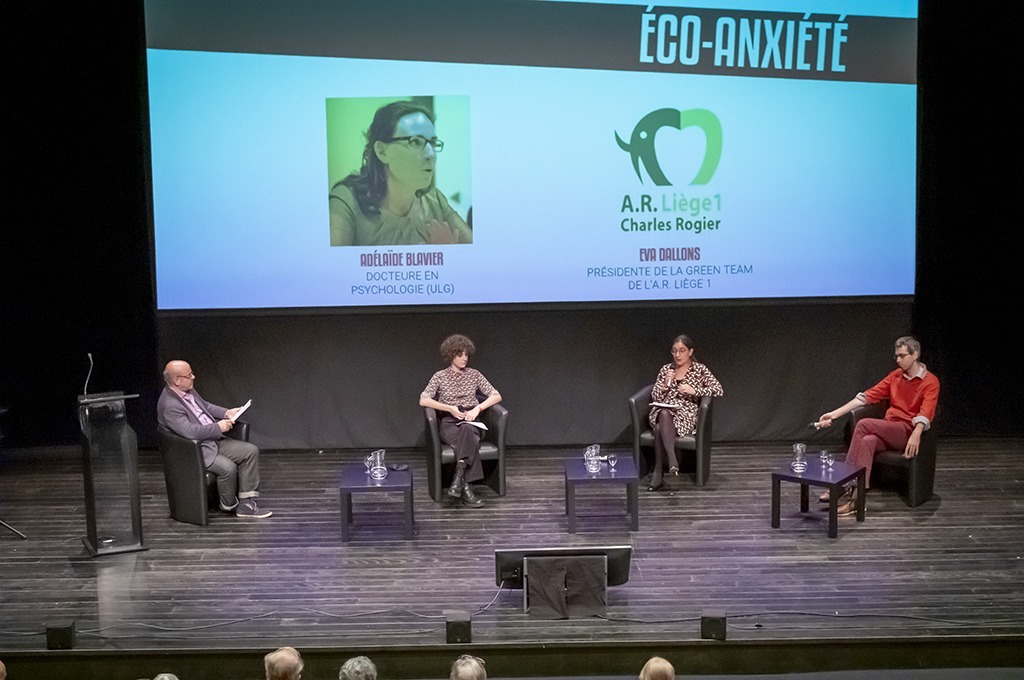 L’éco-anxiété, notamment chez les jeunes, a été ensuite au centre des discussions avec Adélaïde Blavier, docteure en psychologie (ULg), et Eva Dallons, présidente de la Green Team de Liège 1 (A.R. Charles Rogier). Avec également les interventions (en vidéo) d’Alexandre Heeren, chercheur en sciences psychologique (UCLouvain), auteur d’une étude sur le sujet, et de la philosophe des sciences et éthologue Vinciane Despret.