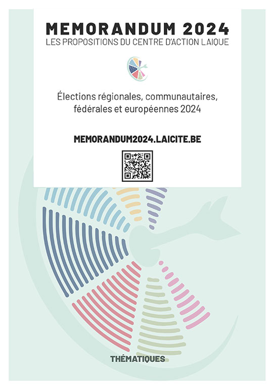 Le présent mémorandum présente les pistes de solutions et recommandations proposées par le Centre d’Action Laïque dans la perspective des élections du 9 juin 2024. Il illustre la manière dont le mouvement laïque souhaite que soient traduites les valeurs de liberté, d’égalité et de solidarité dans une série d’actions emblématiques. Il se veut être tant une invitation au dialogue qu’une interpellation des candidats et candidates aux élections de tous les partis démocratiques. Il se veut aussi être un moyen de sensibilisation des citoyens et citoyennes quant à leur capacité d’agir sur les décisions politiques.